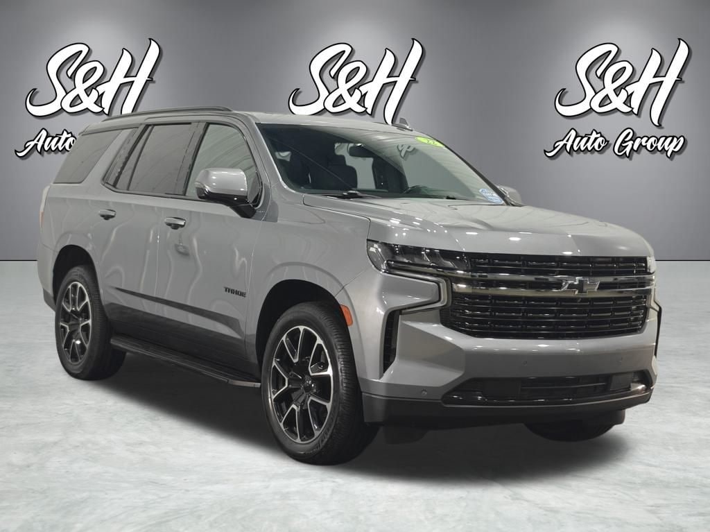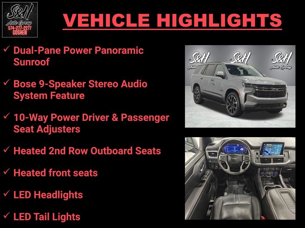CARFAX One-Owner. LED Headlights, LED Tail Lights, Remote Start, Google Services Built-In, 4WD, Jet Black w/Perforated Leather Seat Trim, Apple CarPlay/Android Auto, Bose 9-Speaker Stereo Audio System Feature, Dual-Pane Power Panoramic Sunroof, HD Surround Vision, Heated 2nd Row Outboard Seats, Heated Driver & Front Passenger Seats, Navigation System. Satin Steel Metallic 2022 Chevrolet Tahoe RST 4x4 4WD 10-Speed Automatic with Overdrive 4D Sport Utility EcoTec3 5.3L V8 15/20 City/Highway MPG