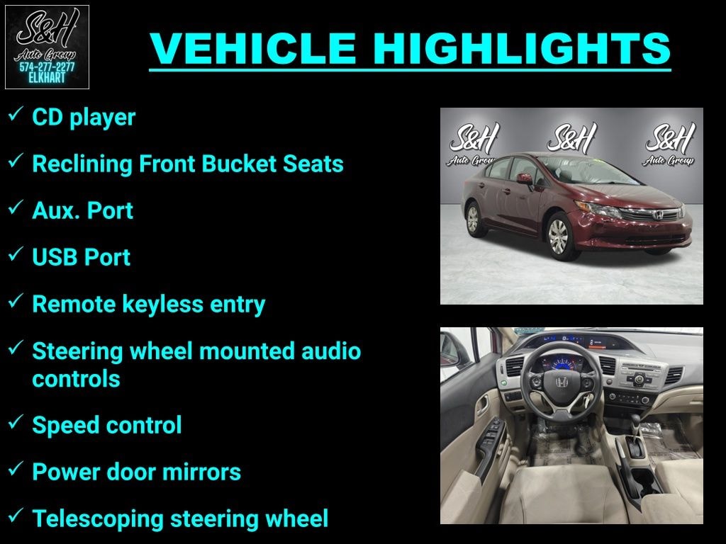 Cloth. Red 2012 Honda Civic LX FWD 5-Speed Automatic 4D Sedan 1.8L I4 SOHC 16V i-VTEC 28/39 City/Highway MPG