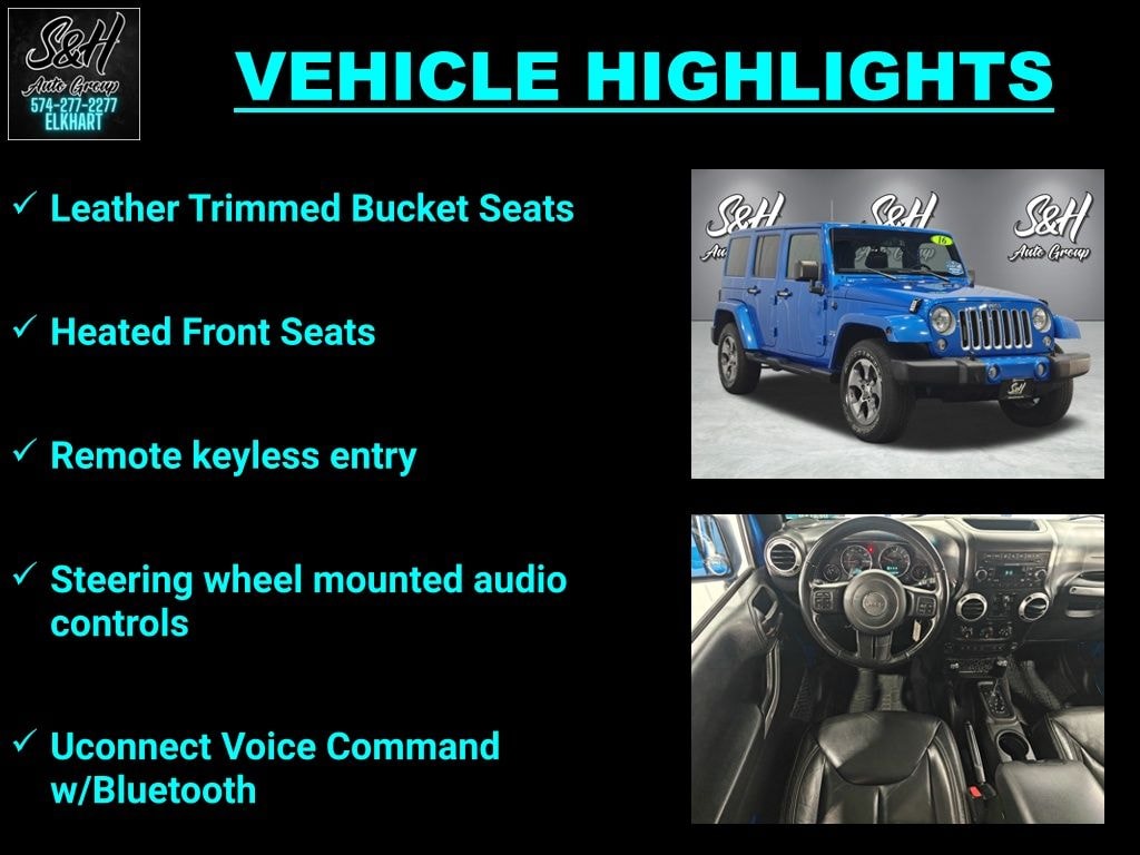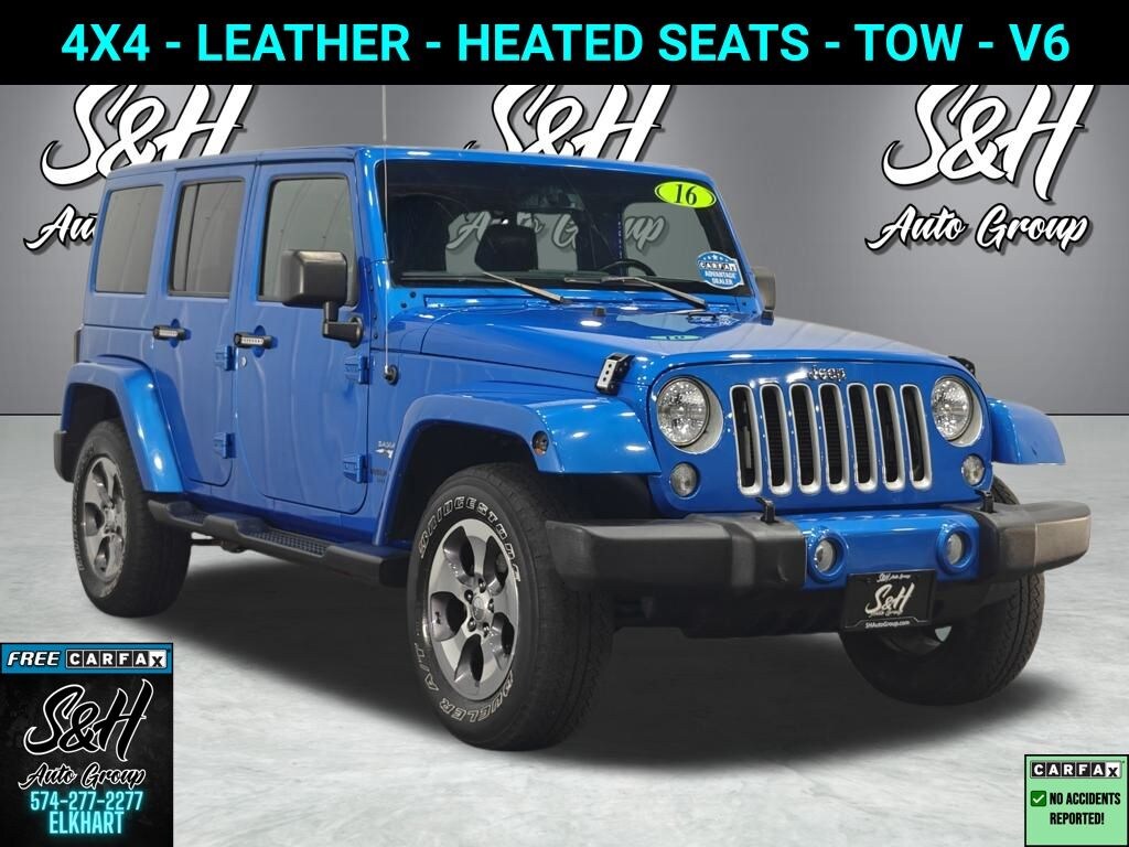 Clean CARFAX. Heated Front Seats, Leather Trimmed Bucket Seats, Remote keyless entry, Steering wheel mounted audio controls, Uconnect Voice Command w/Bluetooth. Hydro Blue Pearl Coat 2016 Jeep Wrangler Unlimited Sahara 4x4 4WD 5-Speed Automatic 4D Sport Utility 3.6L V6 24V VVT 16/20 City/Highway MPG