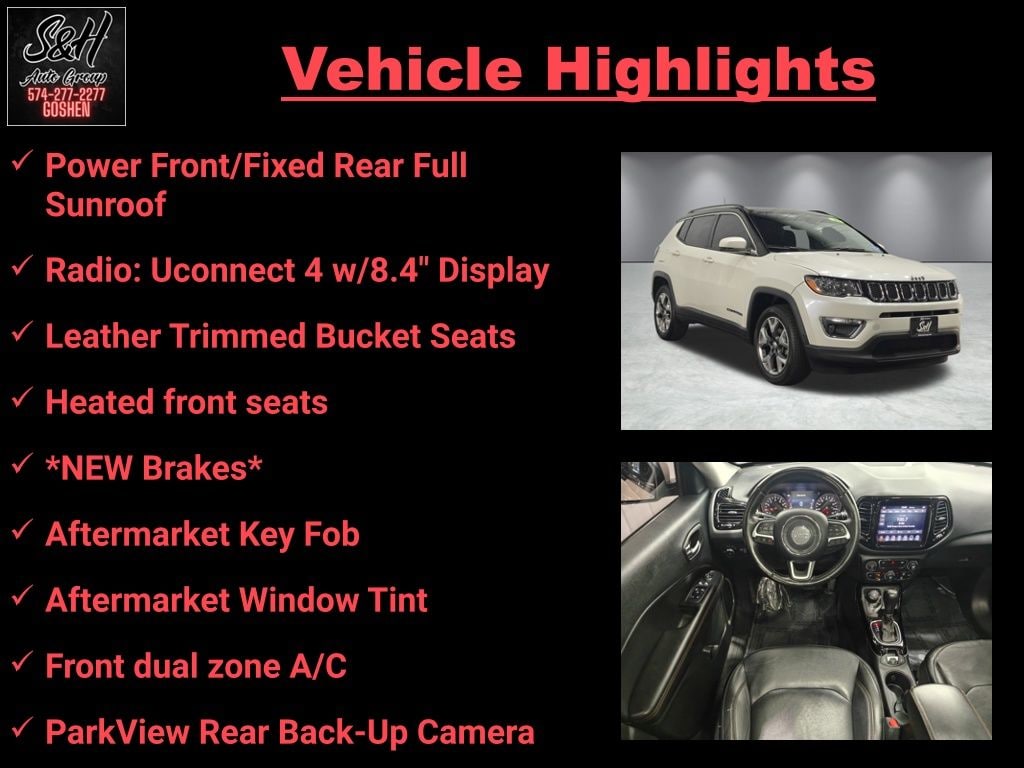 *NEW Brakes*, Aftermarket Key Fob, Aftermarket Window Tint, 4WD, Apple CarPlay/Android Auto, Front dual zone A/C, Heated front seats, Heated steering wheel, Leather Trimmed Bucket Seats, ParkView Rear Back-Up Camera, Power Front/Fixed Rear Full Sunroof, Radio: Uconnect 4 w/8.4" Display. Pearl White Tri-Coat 2020 Jeep Compass Limited 4x4 4WD 9-Speed 948TE Automatic 4D Sport Utility 2.4L I4 22/30 City/Highway MPG