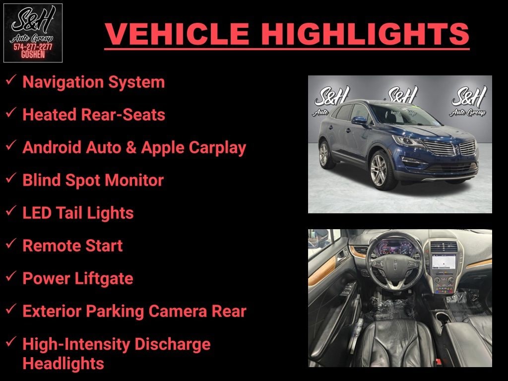 Android Auto & Apple Carplay, Blind Spot Monitor, LED Tail Lights, Remote Start, Exterior Parking Camera Rear, Garage door transmitter: HomeLink, Heated Rear-Seats, Heated Steering Wheel, High-Intensity Discharge Headlights, Navigation System, Power Liftgate, Premium Heated/Cooled Leather-Trimmed Bucket Seats, SYNC 3 Communications & Entertainment System. Sapphire Blue Metallic 2017 Lincoln MKC Reserve AWD AWD 6-Speed Automatic 4D Sport Utility 2.0L GTDi 19/25 City/Highway MPG