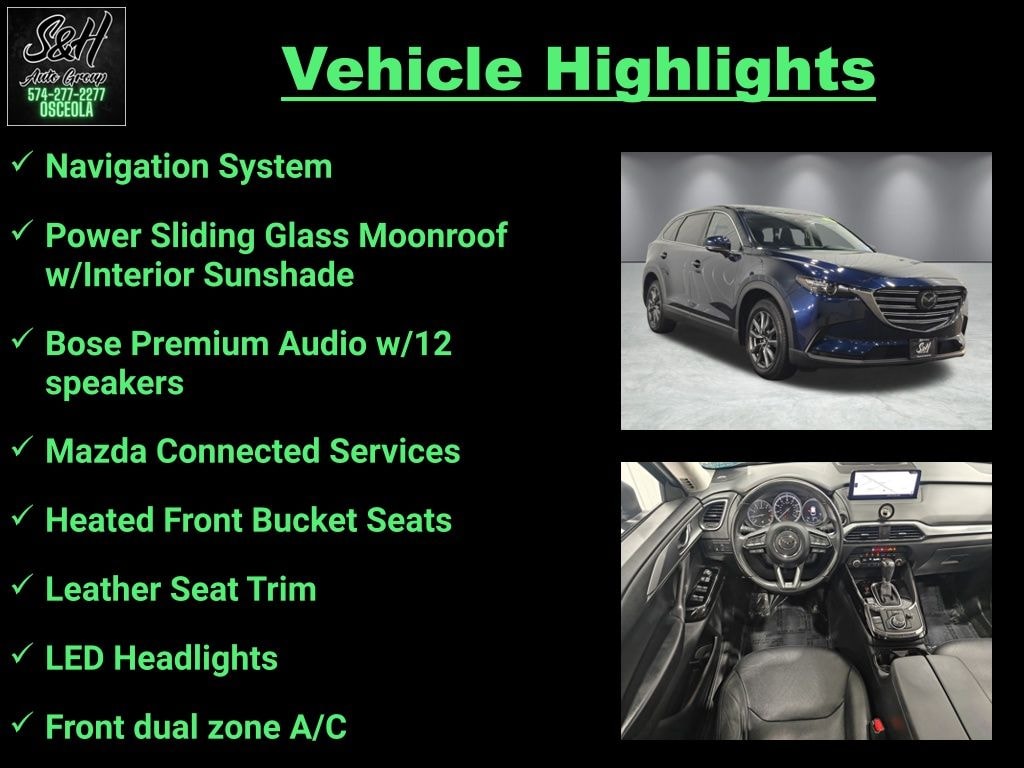 LED Headlights, AppLink/Apple CarPlay and Android Auto, Bose Premium Audio w/12 speakers, Exterior Parking Camera Rear, Front dual zone A/C, Garage door transmitter: HomeLink, Heated Front Bucket Seats, Leather Seat Trim, Mazda Connected Services, Navigation System, Power Liftgate, Power Sliding Glass Moonroof w/Interior Sunshade, Wireless Phone Charger. Deep Crystal Blue Mica 2021 Mazda CX-9 Touring FWD FWD FWD 6-Speed Automatic 2.5L 4-Cylinder