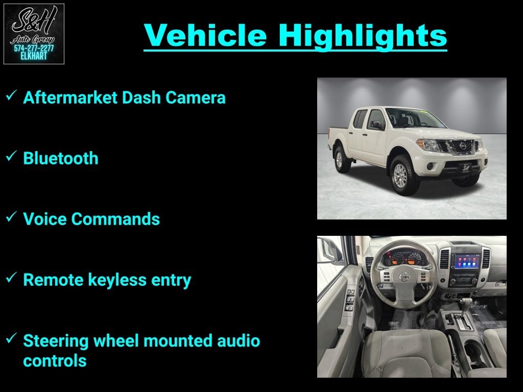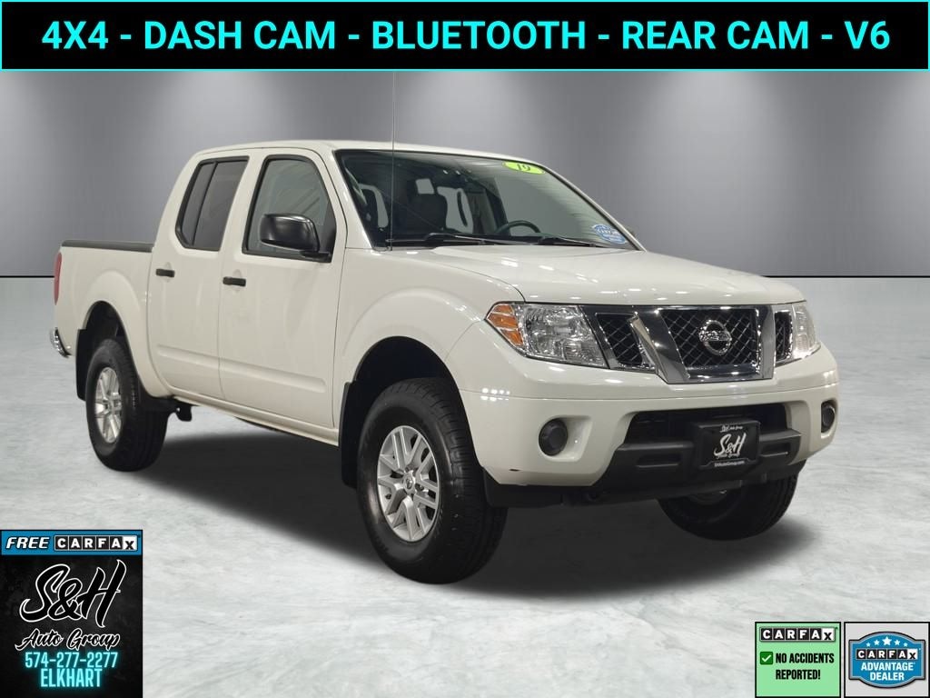 Clean CARFAX. Aftermarket Dash Camera, Bluetooth, Voice Commands, 4WD, Remote keyless entry, Steering wheel mounted audio controls. Glacier White 2019 Nissan Frontier SV 4x4 4WD 5-Speed Automatic with Overdrive 4D Crew Cab 4.0L V6 DOHC 15/21 City/Highway MPG