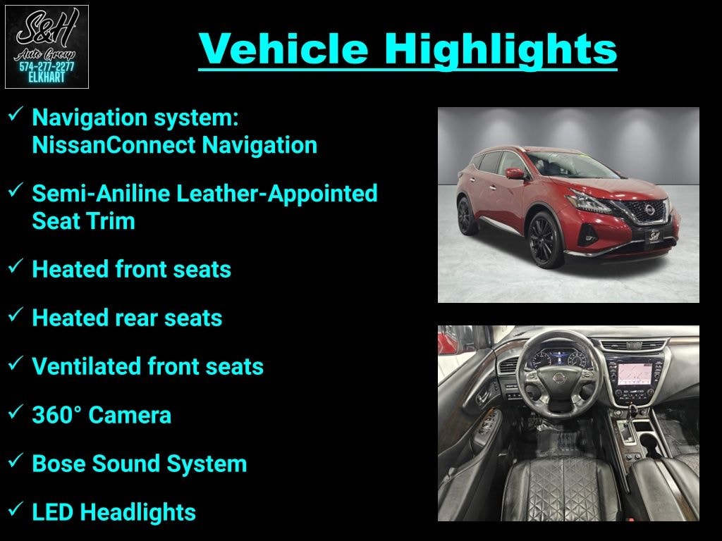 360° Camera, Bose Sound System, LED Headlights, LED Tail Lights, Panoramic Vista Sunroof, Remote Start, CVT with Xtronic, AWD, Garage door transmitter: HomeLink, Heated front seats, Heated rear seats, Navigation system: NissanConnect Navigation, NissanConnect featuring Apple CarPlay and Android Auto, Semi-Aniline Leather-Appointed Seat Trim, Ventilated front seats. Cayenne Red Metallic 2020 Nissan Murano Platinum AWD AWD CVT with Xtronic 4D Sport Utility 3.5L V6 DOHC 24V 20/28 City/Highway MPG