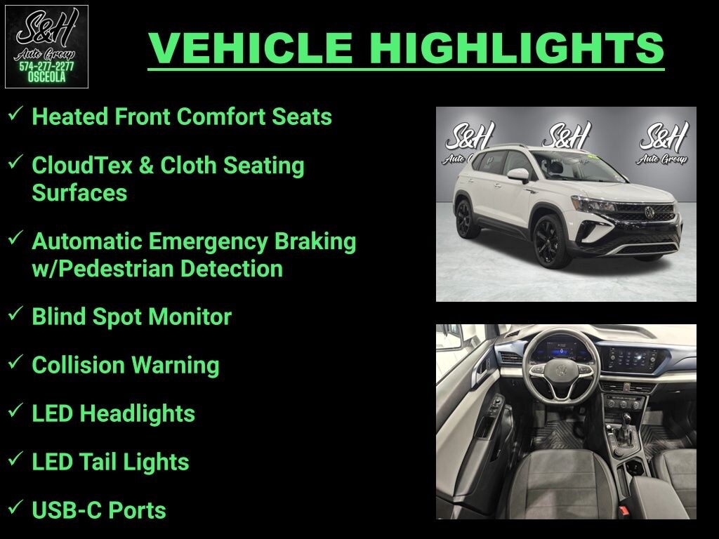 Safety is a top priority in the Taos, with features like Automatic Emergency Braking, Blind Spot Monitor, and Rear Cross Traffic Alert keeping you and your passengers protected. The Panoramic Sunroof Package adds an extra touch of luxury, while the Heated Front Comfort Seats and Wireless Charging provide unparalleled convenience.